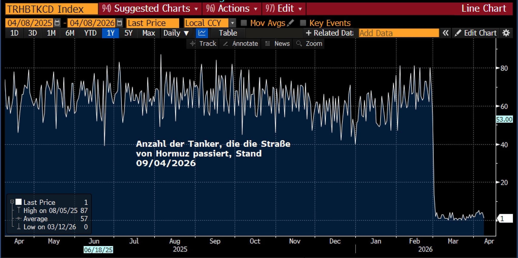 Die Bedingungen für den Waffenstillstand zwischen den USA und dem Iran werden von beiden Seiten höchst unterschiedlich interpretiert. Die Straße von Hormuz bleibt de facto geschlossen, da der Iran weiterhin darauf besteht, die Durchfahrt zu kontrollieren und eine Transitgebühr von 2 Mio. USD pro Schiff zu erheben. Gepaart mit den anhaltenden Angriffen Israels gegen den Libanon bleibt die Gesamtsituation äußerst