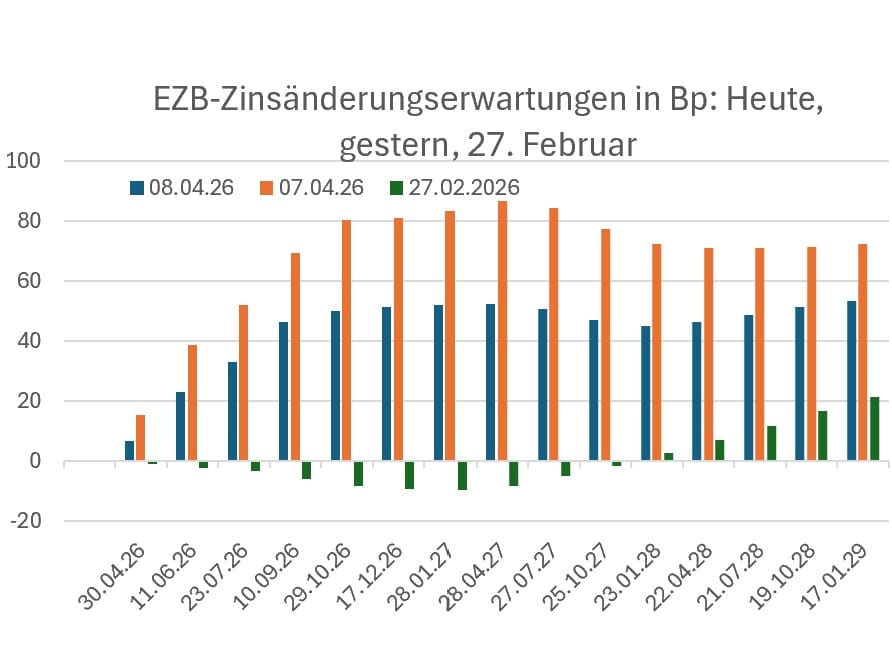 Die €STR-Forwards für Dezember 2026 verzeichneten heute (08. April) einen bemerkenswerten Rückgang von über 25 Basispunkten im Vergleich zum Vortag und entsprechend versteilte sich die EUR-Zinskurve (2J -21 Bp). Angesichts der massiven Unsicherheit im Vorfeld der am Freitag beginnenden Verhandlungen in Islamabad erscheint diese Entlastungsrallye auf den ersten Blick zu ausgeprägt. Dennoch halten wir von Zins² es für wenig attraktiv, derzeit auf eine Gegenbewegung (also wieder steigende Zinserwartungen) zu setzen. Denn trotz des heutigen Rücksetzers notieren die Dezember-Forwards weiterhin rund 60 Basispunkte über dem Niveau vom 27. Februar, was zeigt, dass eine beträchtliche Risikoprämie im Markt verbleibt.