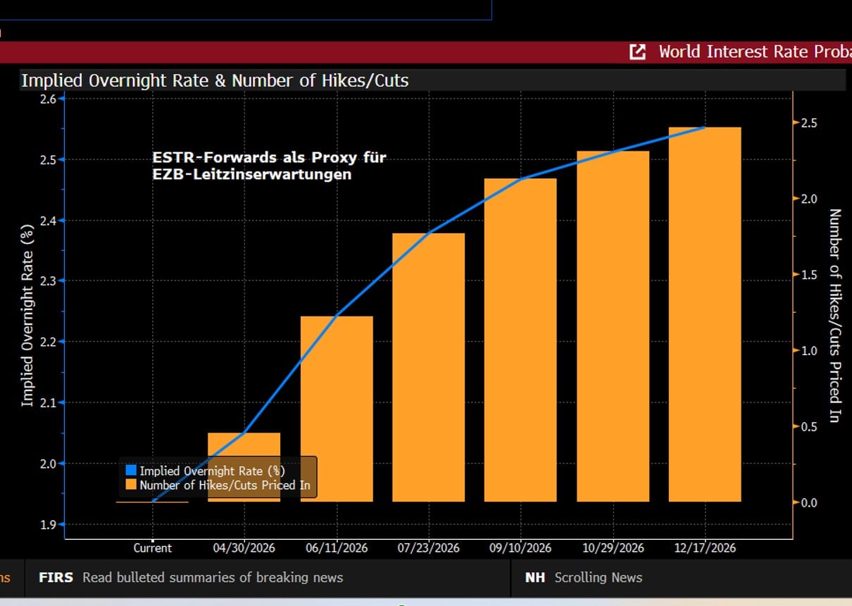 Die aktuelle Erleichterung an den Märkten greift daher zu kurz. Solange die Straße von Hormus nicht wieder generell geöffnet ist, werden die Risikoprämien für Rohöl, LNG sowie für energieintensive Vorprodukte wie Düngemittel und Grundchemikalien auf einem strukturell erhöhten Niveau verharren. Inflations- und Wachstumsrisiken bleiben erhöht auch wenn dies die globalen Regionen asymmetrisch trifft: Während die US-Wirtschaft als Nettoenergieexporteur eine relative Resilienz aufweist, stehen die energieimportabhängigen Industriezentren in Asien und Europa unter starkem Druck. Vor diesem Hintergrund mahnen wir von Zins² zur Vorsicht: Den jüngsten Rückgang der Risikowahrnehmung zu extrapolieren, halten wir im aktuellen geopolitischen Umfeld für verfrüht. Auch am kurzen Ende der EUR-Zinskurve dürfte das Auspreisen von EZB-Zinssteigerungserwartungen bald auf Widerstand stoßen und eine Wahrscheinlichkeit von klar unter 50 % für einen ersten EZB-Zinsschritt Ende April würden wir aktuell nicht "kaufen".