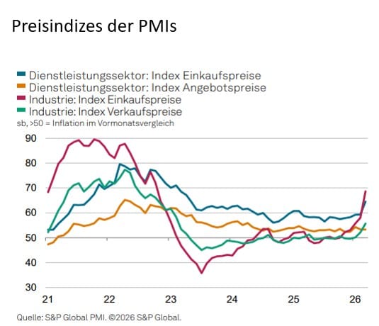 Die vorläufigen Einkaufsmanagerindizes (PMI) für die Eurozone im März 2026 bestätigen Stagflationssorgen. Zwar signalisiert der Composite PMI mit 50,5 Punkten formal noch ein minimales Wachstum, doch geht die Dynamik zurück. Der für die Gesamtstabilität entscheidende Dienstleistungssektor ist nahezu zum Stillstand gekommen (50,1 nach 51,9 im Vormonat). Gleichzeitig nehmen die Einkaufspreise deutlich zu und der Kostenschub wird von den Unternehmen an die Endkunden weitergegeben. Die Geschäftsaussichten für das kommende Jahr sind infolgedessen so pessimistisch wie seit dem Beginn der russischen Invasion in der Ukraine nicht mehr. Ohne eine schnelle Entspannung am Persischen Golf haben die Einkaufsmanagerindizes angesichts der sich verschärfenden Wachstumsabschwächung in den kommenden 2 Monaten noch erhebliches Rückschlagpotential. Aufgrund der massiv expansiven Fiskalpolitik dürfte Deutschland dabei im Vergleich zu anderen Eurolandstaaten outperformen.