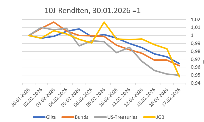 10jährige Renditen gehen in den wichtigsten Anleihemärkten aktuell deutlich zurück, und die Kurven verflachen sich zwischen 2 und 10 Jahren. Mit 4,02 % nähern sich 10jährige US-Treasuries der wichtigen technischen Unterstützungszone (3,95–4,00 %), und auch 10jährige Bunds notieren nur noch 3 Bp über der 200-Tagelinie (2,70 %). Die Abwärtsdynamik bei internationalen Renditen erhielt in den letzten zwei Wochen auch Rückenwind aus Japan, wo trotz des deutlichen Wahlsiegs von Ministerpräsidentin Takaichi am 8. Februar (2/3Mehrheit im Unterhaus) und Erwartungen einer expansiven Fiskalpolitik die JGB-Renditen deutlich zurückkamen.