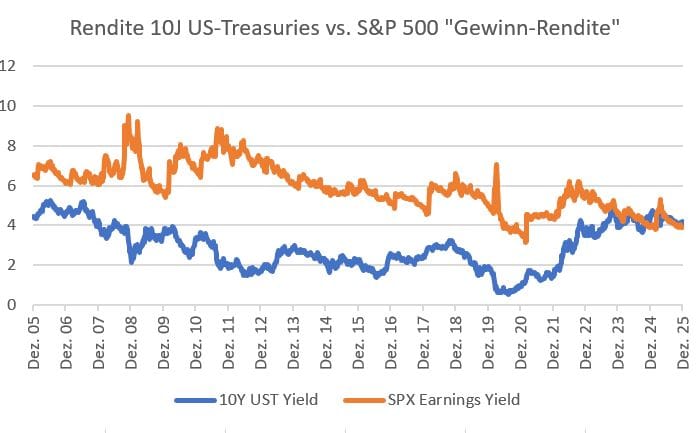 Die Konsensschätzungen für 2026 sind ausgehend von den Niveaus kurz vor Weihnachten klar positiv: S&P 500 +9,7%, EuroStoxx 50 +7,1%, Nikkei +14,2%. Gleichzeitig liegt die Gewinnrendite des S&P 500 (Reziprok des KGVs) inzwischen aber unter der Rendite 10‑jähriger US‑Treasuries – die Equity Risk Premium ist also negativ. Aktien sind im Vergleich zu