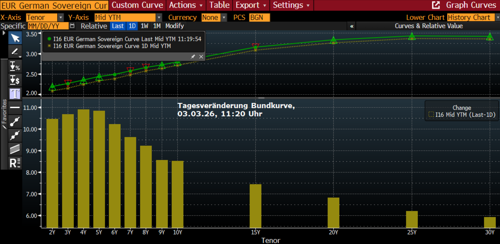 Das eigentliche Problem ist hierbei der Hebel: Da viele dieser Positionen fremdfinanziert sind, lösen erste Verluste eine Kaskade von Margin Calls und Limitverletzungen in den Risikomodellen aus. In einer solchen Phase wird die fundamentale Bewertung zur Nebensache. Marktteilnehmer sind gezwungen, Positionen in sämtlichen Segmenten zu liquidieren, um ihre Gesamtrisikobudgets zu schützen – getreu dem Motto: „Verkauft wird nicht, was man verkaufen will, sondern was man verkaufen kann.“ Dies zieht auch Segmente in den Abgrund, die fundamental keinerlei Verbindung zum ursprünglichen Konflikt aufweisen. Die Diversifikation, die eigentlich als Schutzschild dienen sollte, löst sich in Luft auf, während die Korrelationen zwischen den Asset-Klassen gegen 1 tendieren. Das Ergebnis sind brutale Marktbewegungen ohne Rücksicht auf Verluste, wie das aktuelle Bear-Flattening der EUR-Zinskurve eindrucksvoll demonstriert.