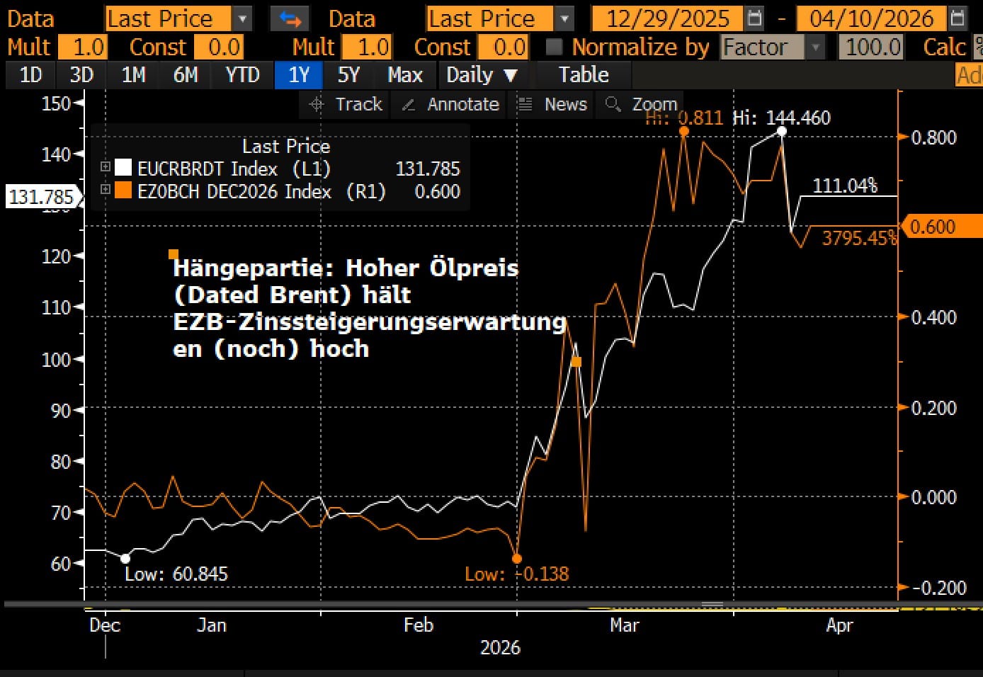 2. Auswirkungen auf die Inflation und EZB-Politik: Ein Ölpreis um 100 USD entspräche in etwa dem Niveau vom 11. März, das bereits in die damaligen EZB-Projektionen einfloss. Dies impliziert einen Anstieg der Gesamtinflationsrate auf etwa 3,2% bis August/September, gefolgt von deutlichen Rückgängen Richtung 2% im kommenden Jahr. Solange der Waffenstillstand über die EZB-Sitzung am 30. April hinaus hält, wird die Zentralbank versuchen, den Inflationsanstieg als transitorisch einzustufen. Entsprechend ist die Wahrscheinlichkeit einer Zinsanhebung Ende April im Vergleich zu unserer Einschätzung im Zins²-Kompass vor zehn Tagen gesunken. Ein Zinsschritt im Juni wäre – abhängig von den neuen Inflationsprojektionen – das realistischere Szenario. Aktuell preisen die €STR-Forwards 27 Basispunkte (Bp) an Zinssteigerungen bis zum 11. Juni und etwa 60 Bp bis Jahresende ein. Letzteres erscheint weiterhin ambitioniert. In dem von uns als dominant erwarteten Szenario von Verhandlungen, die dann über 2 Wochen hinaus verlängert werden, gehen wir davon aus, dass diese Risikoprämie bis Ende Mai in Richtung 40 Bp reduziert wird.