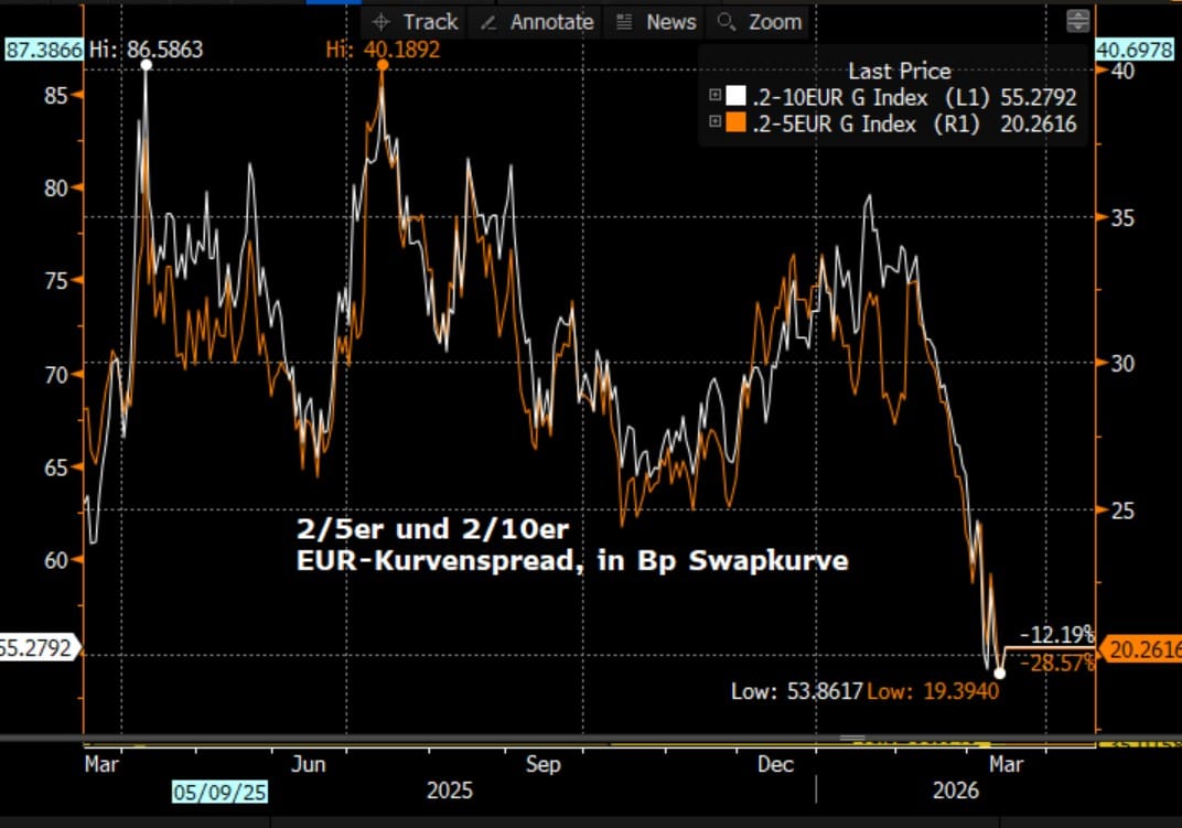 Für den Rentenmarkt bedeutet dies, dass die Zinserhöhungserwartungen für die EZB über die aktuell eingepreisten 40 Basispunkte bis zum Jahresende leicht nachgeben sollten, was wiederum die gehandelte Zinsvolatilität etwas dämpfen dürfte. Mit 2-jährigen Swapsätzen nahe der Marke von 2,60% erscheinen Steepener-Positionen in den Segmenten 2/10 oder 2/5 attraktiv. Zudem bleibt das Risiko bei den Peripherie-Spreads gegenüber Bundesanleihen asymmetrisch nach unten gerichtet (Tightening). Die geopolitische Krise wirkt hier als Katalysator für die Überzeugung, dass die Diskussion um weitere gemeinschaftliche Finanzierungsanstrengungen innerhalb der EU – analog zum NGEU-Modell während der Pandemie – erneut an Fahrt gewinnen wird. Sollte die Krise um den Iran weiter eskalieren, würde der Ruf nach gemeinschaftlichen Stützungsmaßnahmen und europäischer Solidarität laut, was den Peripherie-Spreads zusätzlichen Rückenwind verleihen dürfte.