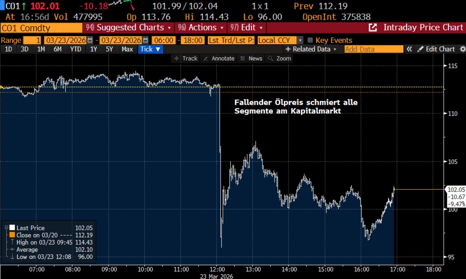 Auch wenn die Details derzeit noch widersprüchlich erscheinen, wertet der Kapitalmarkt Trumps jüngste Ankündigung, das Ultimatum gegen den Iran um 5 Tage zu verlängern und geplante Angriffe auf die iranische Energieinfrastruktur vorerst auszusetzen, als das erhoffte „Taco“-Szenario (Deeskalation). Die Reaktion der Märkte folgte prompt: Der Ölpreis korrigierte spürbar Richtung der 100-USD-Marke, während Zinssteigerungserwartungen an die Fed, EZB und BoE merklich zurückgeschraubt werden. An den Aktien- und Creditmärkten dominiert ein kräftiges Short-Covering, da viele Marktteilnehmer auf dem falschen Fuß erwischt werden.