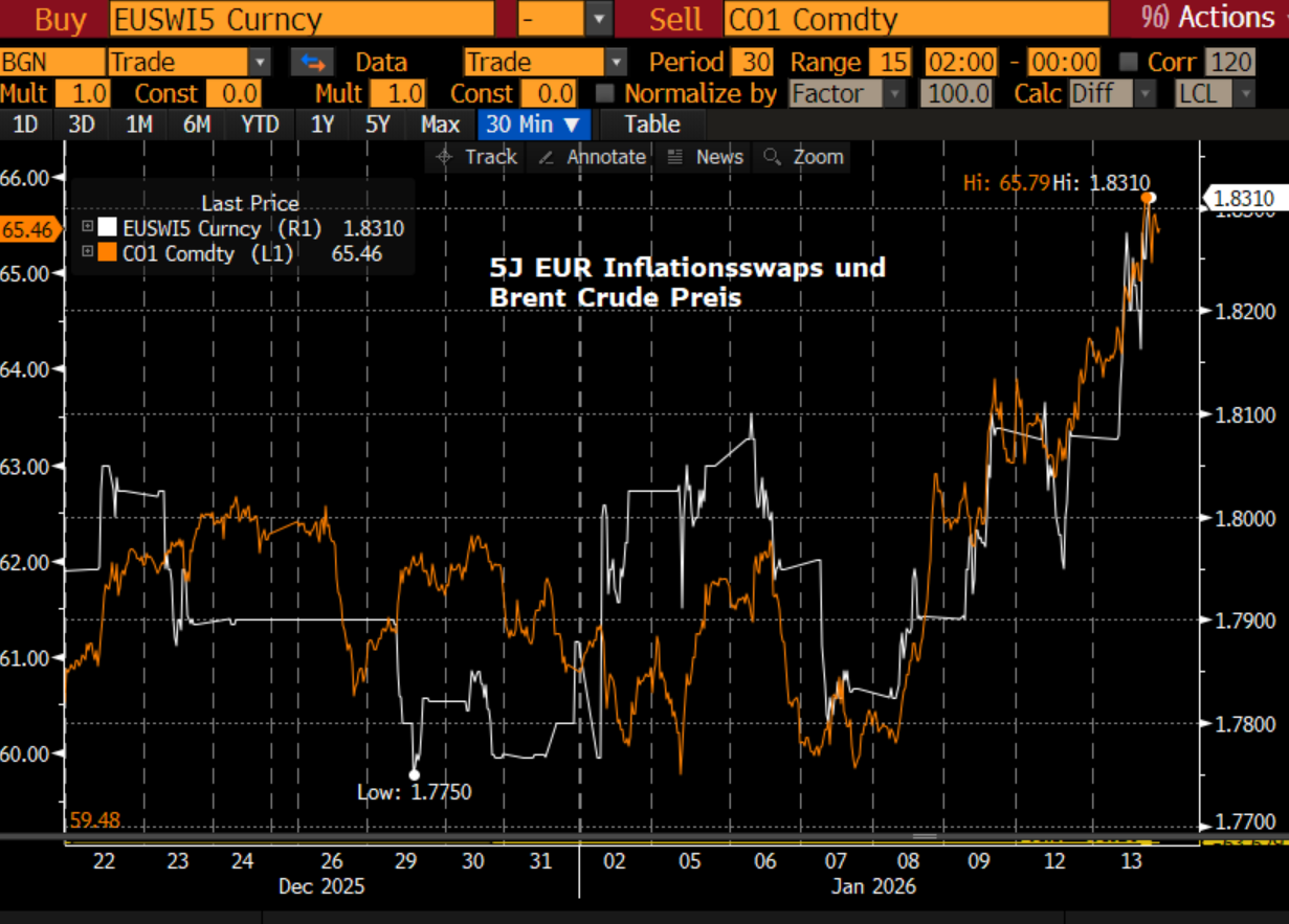 Donald Trumps direkte Ansprache an das iranische Volk sorgt für Bewegung an den Energiemärkten und Brent Crude klettert auf 65,5 USD (höchster Wert seit Ende Oktober) und testet die 200-Tage-Linie von unten. Das Risiko eines schnellen militärischen Eingreifens der USA muss als recht hoch eingeschätzt werden. Der höhere Ölpreis zieht die Inflationserwartungen (Breakevens) mit sich. Für EUR- und USD-Staatsanleihen