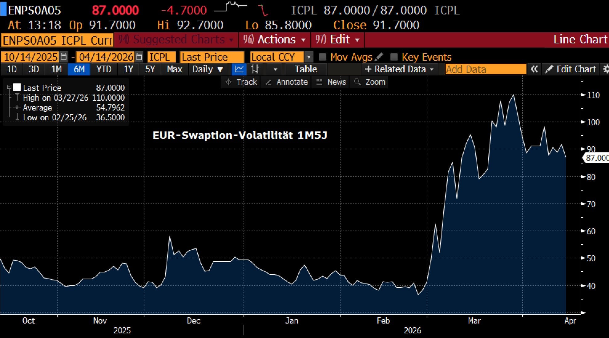 Die jüngsten Entwicklungen am Persischen Golf stützen die Einschätzung von Zins², dass zwar die Form einer endgültigen Konfliktbeilegung unklar bleibt, derzeit jedoch keine der Parteien ein Interesse an einer anhaltenden militärischen Eskalation zeigt. Aus Marktsicht bleibt eine Verhandlungslösung das dominante Szenario, was mit leichten Rückgängen beim Ölpreis (95-100 USD Brent Crude Front Contract) und einer voraussichtlich etwas steileren EUR-Zinskurve einhergehen sollte. Renditen 10-jähriger Bundesanleihen von über 3% dürften weiter auf Kaufinteresse stoßen. Die Rekordnachfrage von 148 Mrd. GBP bei der heutigen Auktion 10-jähriger Gilts unterstreicht die Wahrnehmung, dass Duration auf hohen absoluten Renditeniveaus (10J Gilt bei ca. 4,9%) gesucht ist. Die implizite Zinsvolatilität sollte eher etwas zurückgehen, da Zinserhöhungserwartungen für die EZB, die aktuell noch deutlich über 50 Basispunkte bis Jahresende hinausgehen, reduziert werden dürften. In Erwartung dieses Szenarios haben wir gestern Gamma verkauft und kurzfristige Put-Optionen auf den Bobl-Kontrakt geschrieben, nachdem wir in den Tagen zuvor schon den Kontrakt outright kauften.