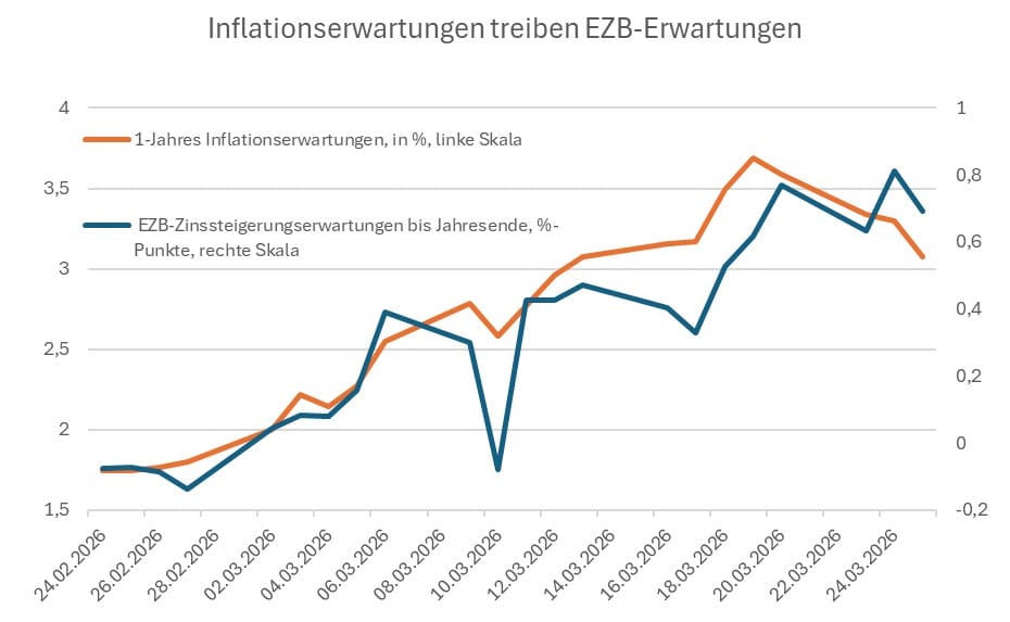 Trotz widersprüchlicher Signale aus Washington und Teheran bezüglich der Bedingungen für ein Ende der militärischen Konfrontation setzen die Kapitalmärkte zunehmend auf eine Verhandlungslösung. Dies führt bei Aktien und Credit-Titeln aktuell zu deutlichem Short-Covering, während die Inflationssorgen am Markt nachlassen. So sind die 1-Jahres-Inflationsswaps seit dem Hoch am 19.03. von 3,69% auf zuletzt „nur noch“ 3,07% gefallen. Die 1J1J Inflationsforwards notieren mit 2,11% nur leicht oberhalb der Zielmarke der EZB. Entsprechend gibt die EUR-Zinskurve spürbar nach. Angesichts der massiven US-Truppenverlegungen in die Golfregion sowie des erratischen Naturells von US-Präsident Trump wären wir zwar überrascht, wenn es vor Ablauf des fünftägigen Ultimatums – spätestens zum kommenden Wochenende – nicht erneut zu Volatilitätsschüben käme. Dennoch nimmt aus Sicht von Zins² das Tail-Risk einer unkontrollierten Eskalation (=Invertierung der EUR-Zinskurve zwischen 2 und 10 Jahren) sukzessive ab.
